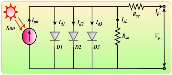 The TDM equivalent circuit for the PV cell, as depicted in Figure 1, presents a sophisticated representation that integrates a photocurrent source with three parallel-connected diodes. Each diode within this configuration plays a distinct role in mimicking the various physical phenomena that occur within the PV cell. Diode D1 is tasked with replicating the diffusion process of minority carriers across the depletion layer, a critical mechanism for the generation of photocurrent in response to solar irradiation. This diode effectively models the movement of these carriers from regions of higher concentration to lower concentration within the cell, contributing to the overall current flow. The role of Diode D2 is to represent the recombination of carriers within the space-charge region of the junction. This area, crucial for the cell’s operation, is where the electric field assists in separating the photo-generated electron–hole pairs. However, some of these carriers recombine before contributing to the current loss mechanism that D2 accounts for within the model. Lastly, Diode D3 explores the effects of significant leakage currents and recombination losses, specifically in the defect regions of the cell. These areas, characterized by imperfections within the crystal lattice, can significantly impact the cell’s efficiency. D3 models the influence of these defects, which can lead to additional recombination and leakage paths for carriers, detracting from the cell’s overall performance. Through the incorporation of these three diodes, the TDM offers a comprehensive framework for understanding the intricate internal processes of the SPV cell, enabling more accurate predictions of its behaviour under various operating conditions.