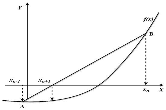 Geometrically, as illustrated in Figure 2, this approximation is similar to replacing the curve with the secant line AB, where is the intersection point of AB with the x-axis.