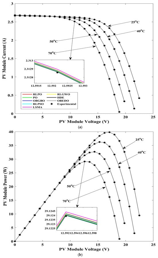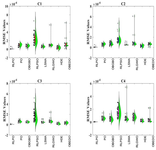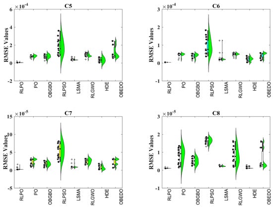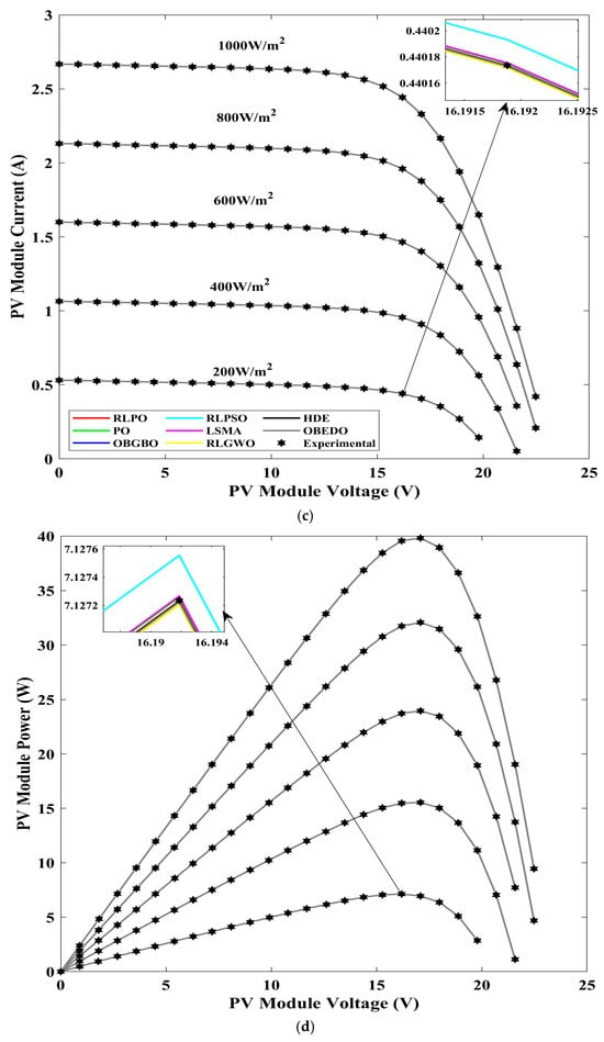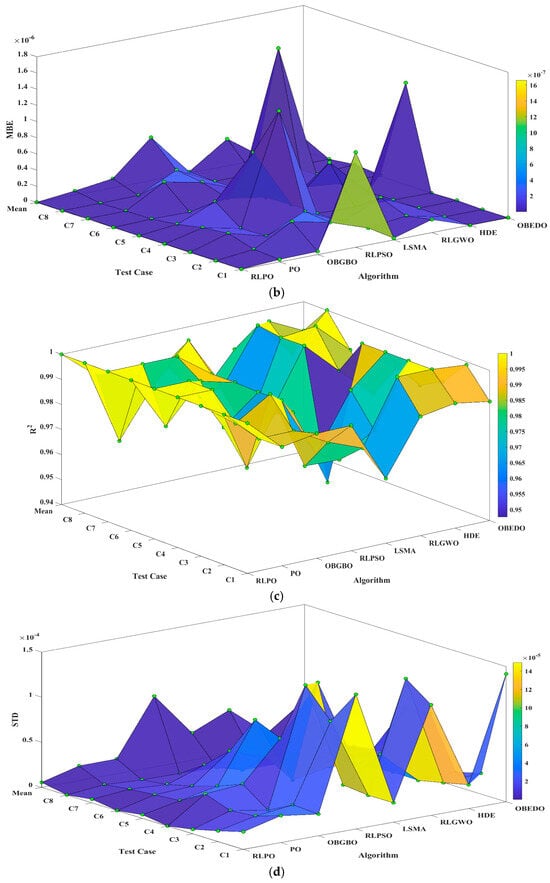 Each algorithm was configured with a consistent population size of 40 and executed for a maximum span of 1000 iterations. The findings from these simulations, especially across different case studies, are displayed in Table 4. This table elaborates on the comparative analysis of nine critical parameters of the TDM of the photovoltaic module as evaluated by each algorithm. Table 4 reveals a predictable decrease in photocurrent corresponding with falling irradiance levels, a result that is in agreement with established physical principles indicating that the photocurrent in PV modules is directly proportional to irradiance intensity. The ideality factors for the diodes were adjustable up to a maximum value of 5, a range specifically chosen to cover potential variances in defect density and other intrinsic properties of PV modules. The observed values for the reverse saturation currents of the diodes, labelled , , and , largely spanned from 2.33 × 10−5 to 2.67 × 1011. These findings are linked to various factors, such as shifts in ambient temperature impacting photon absorption and an increase in defect density that influences the diode’s ideality factor, with a noted positive relationship between these currents and temperature. It was observed that an adaptive secant technique, while highly responsive to fluctuations in ideality factor values, could prompt divergences in the RLPO algorithm’s optimization process if ideality factors are inaccurately set. A significant decrease was observed in the series and shunt resistance values, moving from roughly 4844.27 and 1.1334 to 317.75 and 1.1193, respectively. Based on the insights from Table 4, the RLPO algorithm exhibited superior parameter dispersion capabilities, underscoring its proficiency in accurately identifying the root values of the parameters and maintaining stability throughout its process. The most favourable results are highlighted in bold, making it straightforward to pinpoint the optimum outcomes yielded by each algorithm.