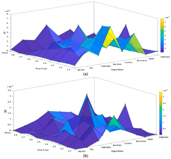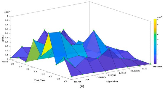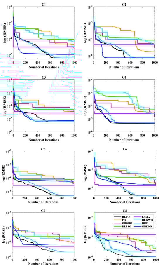 The proposed RLPO algorithm was contrasted with various algorithms, all augmented with an adaptive secant method. These encompassed the RLPO, the Opposition-Based GBO (OBGBO) [66], the Opposition-Based Exponential Distribution Optimizer (OBEDO) [92], the Reinforced Learning-Based Grey Wolf Optimizer (RLGWO) [89,91], the RL-based Particle Swarm Optimizer (RLPSO) [89], the Leader Slime Mould Algorithm (LSMA) [93], Heterogeneous Differential Evolution (HDE) [14], and the original PO [85]. The selection of these algorithms for the comparative study aimed to ensure a comprehensive and diverse analysis across a broad range of methodologies within the domain. The strategic hybridization with an adaptive secant method facilitated a balanced comparison, enabling a reasonable and practical evaluation of the performance across varied algorithms.