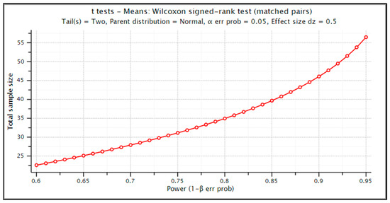 40]. Assuming the expected effect size at the level of d = 0.5, a significance level α = 0.05 in the case of the test used for dependent samples, the test power level of 0.8, which is considered satisfactory [