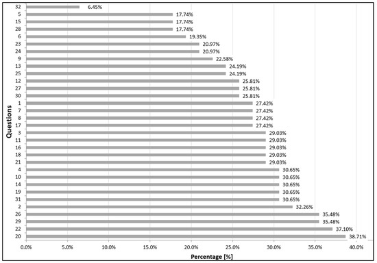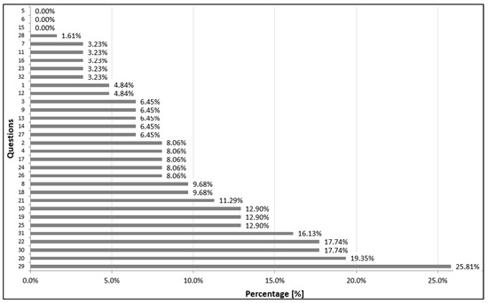 The lowest underestimation occurred within the 32nd question (The composition of the crew is very conducive to a good atmosphere and cooperation in the cockpit); ex aequo the 6th question (Preparing for a flight due to the task (e.g., preparing for the route, submitting a flight plan, arranging arrival, etc.) will require a very large amount of work), the 15th question (Performing activities related to preparing the aircraft for flight (e.g., hangaring, performing pre-flight inspection, refueling) will require a lot of effort) and the 28th question (I will feel a lot of stress during the flight). The ranking of questions according to the criterion of underestimation of pre-flight risk in a group of instructors calculated by formula (1) is depicted in