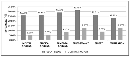 In the group of instructors, greater differences in the level of risk underestimation for individual scales are visible. The highest level of underestimation was recorded in the performance and frustration scales, and the lowest in the mental and physical demand scales. The results of the level of underestimation in individual scales obtained in the group of instructors range from 5.20% to 12.90% (mean—9.0%). The significantly lower level of risk underestimation obtained in this group is also clearly visible. The largest differences between both groups exceeding 20% are visible in the mental, physical and temporal demands scales. The average level of the underestimation for both student and instructors is 18.05%.