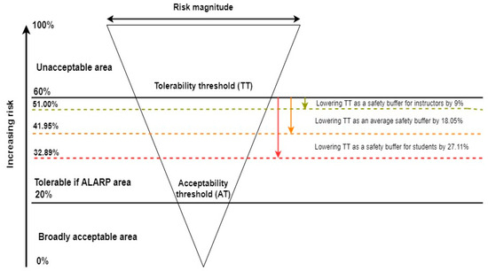 Given that this study examines the effectiveness of estimation in two groups with significantly different aviation experience, namely students and instructors, one can conclude that the results not only applied to the training of inexperienced pilots but are relevant also for all civil aviation. Considering the obtained results, it is necessary to implement appropriate actions to lower the tolerability thresholds for operational residual risk for students by up to 27.11%. This creates a real need to reduce the ALARP scope (assuming a baseline level of 60%) to 32.89%. Consequently, the actual ALARP scope shrinks to a range of almost 13%. In the case of instructors, there is also a need to lower the TT to 51% and reduce the ALARP range to 31%. These conclusions are illustrated in