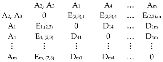 In the subsequent step, the smallest value among all cells in the initial distance matrix (Figure 1) is identified. For example, if the lowest value of Dab in Figure 1 is D23 or D32 (where D23 = D32), this value is designated as the cluster distance (C.D.) for the nth round of improvement. If multiple instances of the lowest Dab values exist, any of these equal values can be selected as the cluster distance (C.D.). Once C.D. = D23 or D32 is determined, areas A2 and A3 are merged into a single group, resulting in the updated distance matrix shown in Figure 2. All values of Ea,(b,c) = E(b,c),a are computed using Equation (15) based on the maximum distance between neighboring groups. These steps are repeated iteratively to group similar areas together until the desired number of clusters is achieved.