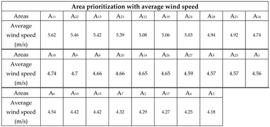 Next, the dataset [26,27], which includes monthly wind speeds (Table 11) and agricultural areas (Table 12), undergoes individual analysis using Entropy–TOPSIS. The analysis begins by applying Equations (1)–(3) to the data in Table 11 and Table 12. This process assigns attribute weight values for each perspective using the Entropy Weight method, as illustrated in Table 13 and Table 14. Then, the attribute weight values for each perspective are combined with the data from Table 11 and Table 12 to produce the initial TOPSIS tables for each perspective across all 28 areas, as presented in Table 15 and Table 16. Next, Equations (4)–(10) of the TOPSIS method is applied to the data in Table 15 and Table 16. This process calculates the performance scores (Pk,i) of 28 areas for each perspective, which are then summarized in Table 17. Therefore, Table 17 should serve as the primary dataset for the subsequent analysis using the Entropy–TOPSIS method in the next step. For clearer comparison, Figure 3 displays the area prioritization results based on average wind speed, monthly wind speed and agricultural areas.