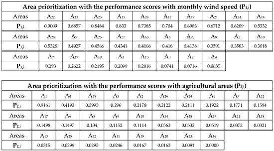 Finally, all Pk,i values are applicable for generating the performance score table across these two perspectives: monthly wind speed and agricultural areas, as depicted in Table 6.