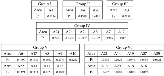 - When σ = 0.9698, wp1 = 0.2146 and wp2 = 0.7854, the order of areas A15 and A25 in Group VI changes. Specifically, the order of area members in Group VI shifts from A21, A14, A19, A27, A25, A15, A20, A18, A16 to A21, A14, A19, A27, A15, A25, A20, A18, A16.