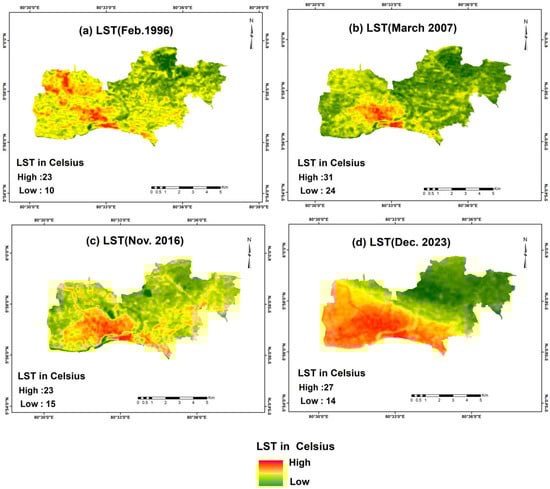 Table A3 provides a summary of the descriptive statistics for the LST values across these years, highlighting key measures such as the minimum, maximum, mean, and standard deviation.