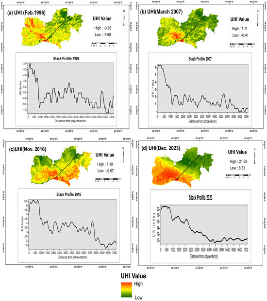 Figure 5 illustrates the variations in the UHI effect in the Matara City area for the years 1996, 2007, 2016, and 2023. The UHI stack profile depicts the changes in UHI values from the city center to the surrounding hinterland areas. The data for Matara City from 1996 to 2023 shows a significant upward trend in the UHI Index, reflecting an intensification of the urban heat island effect over the years.