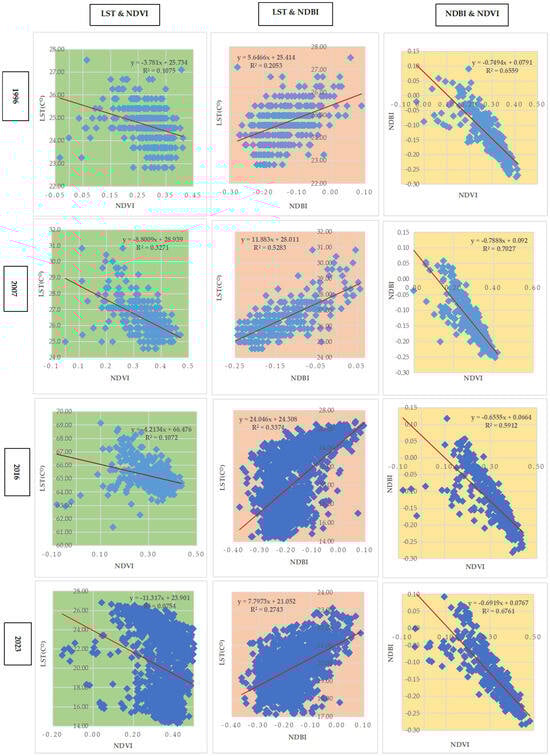 Overall, while the relationship between NDVI and LST weakened over the years, indicating less influence of vegetation on temperature, the correlation between NDVI and NDBI remained strong, pointing to a consistent inverse relationship between vegetation and built-up areas. The connection between NDBI and LST showed moderate variability, suggesting a complex interplay between urbanization and temperature changes.