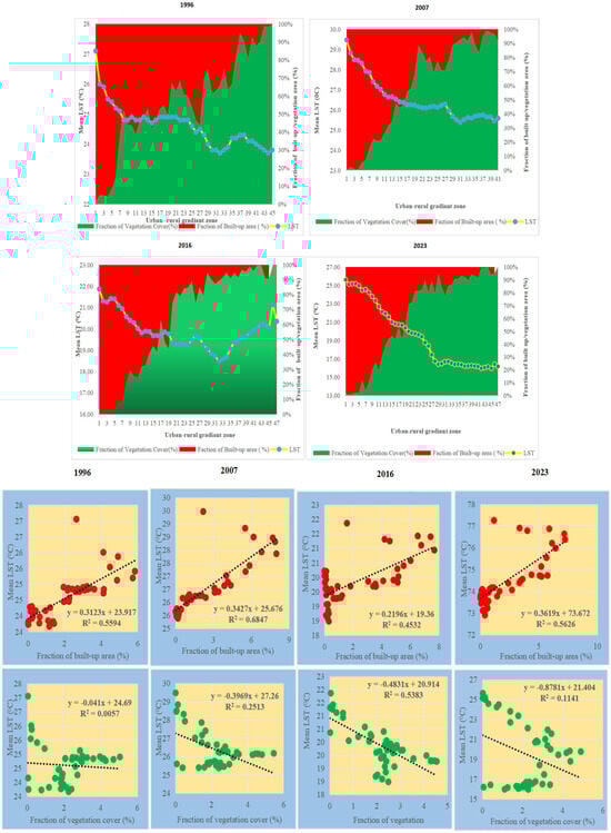 Figure 7), highlights a clear pattern: FBA decreases with increasing distance from the city core, while FVC rises as one moves away from the center. The highest mean LST values, ranging from 29 °C to 27 °C, were observed in URGZs 1 to 10, close to the city center. In contrast, the lowest mean LST values, between 24 °C and 23.7 °C, were recorded in URGZ 40 to 47, situated further from the urban core.