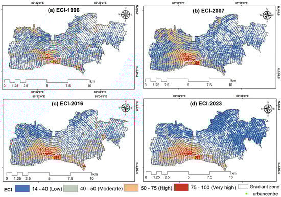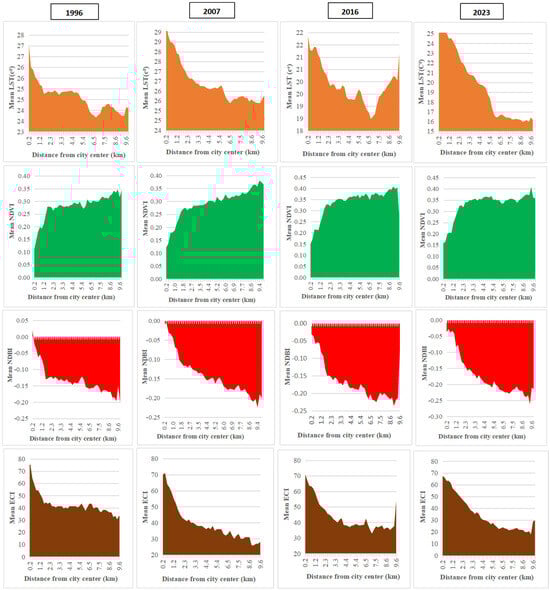 Figure 9 illustrates the distribution patterns of mean LST, mean NDVI, mean NDBI, and mean ECI across gradient zones for the years 1996, 2007, 2016, and 2023. A relatively higher mean LST was observed from the urban core, extending up to 1.2 km outward. The highest mean LST was recorded in 1996 and 2007, followed by a slight decrease in 2016, before rising again by 2023. Across all years, there was a significant drop in LST around 6.5 km from the core, which then increased further outward.