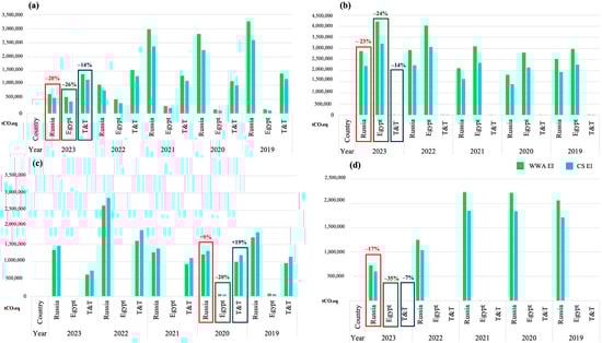 Carbon virtual flows (tCO2eq) distinguishing between WWA and CS emission factors in the timespan 2019–2023 for: (a) ammonia; (b) urea; (c) urea ammonium nitrate; and (d) NPK fertilizers. Notes: T&T = Trinidad and Tobago; WWA = world weighted average; CS = country-specific; EI = environmental impact.