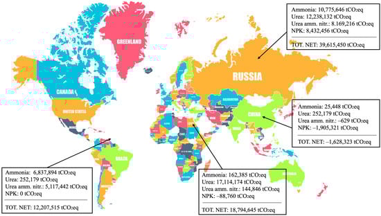 However, a more significant indicator should compare the CO2eq associated with the net trade of fertilizers with the Gross Domestic Product (GDP, expressed in USD), to comprehend the weight of carbon emissions on the GDP [38]. In other words, it could help policy makers and public authorities understand how much the environmental impacts of the production of fertilizers load on the richness of a certain country. Precisely, (i) in Russia, it results in 0.003, which means that, considering one USD produced through the sale of local products, the production of fertilizers is responsible for solely 0.003 kgCO2eq; (ii) in Egypt, it is equal to 0.013; (iii) in Trinidad and Tobago, it is 0.43; and (iv) in China, −1.06 (considering its negative net trade balance and its impressive GDP, which is around USD 18 trillion).