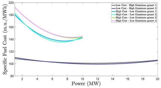For illustration purposes and better understanding of which generator is the most economical for a specified power value, the specific fuel cost of each generator is given in Figure 4.