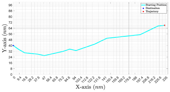 Sea resistance is represented on a two-dimensional plane with the maximum x-axis value equal to 235 nm and the maximum y-axis value equal to 100 nm. This plane is divided into a 50 × 50 cell grid, as shown in Figure 5. Each cell has a fixed sea resistance. The start and destination points are also shown, along with the voyage trajectory that has the minimum sea resistance (the path on which the ship would have encountered the minimum rough weather).