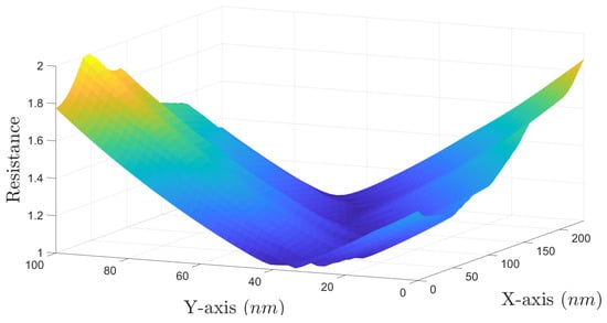 In Figure 6, sea resistance is given in a colored 3D plot. Sea resistances in every grid cell were calculated by finding the distances of the grid cell centers from the minimum sea resistance path, as explained previously. Therefore, it is apparent that the areas that are furthest away from the minimum sea resistance path have the largest sea resistance.
