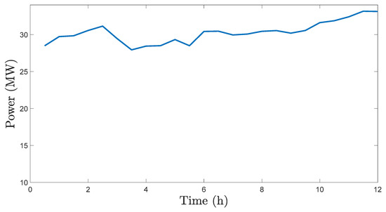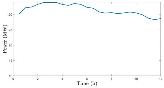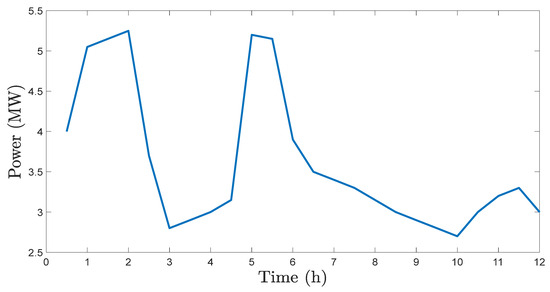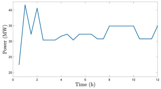 Ship total electric power demand is divided into two categories: the power related to the propulsion load (i.e., the electric motors that propel the ship) and the power related to the rest of ship’s electric loads, denoted as the service load. The ship service load is known for the examined ship voyage and is shown in Figure 7.