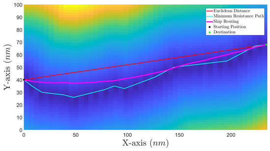 Optimized routing path, along with minimum resistance path, minimum (Euclidean) distance path, sea resistance and start and destination points.