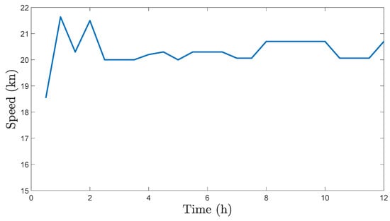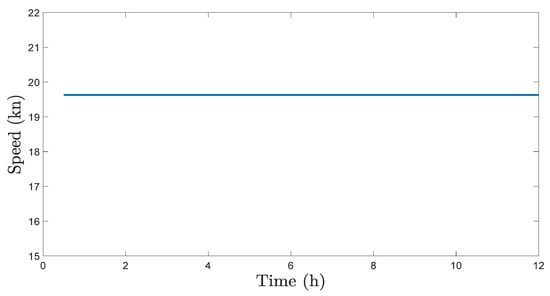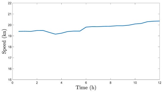 The solution of the optimization problem in (2)–(6) returns the velocity of the ship. The magnitude of ship velocity, which is the speed of the ship, is shown in Figure 9. Ship speed fluctuations are minimal. This is a good result, because increasing and decreasing the speed of the ship results in a drastic increase/decrease in the total power consumption, especially since the propulsion power is proportional to the fourth power of ship speed.