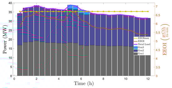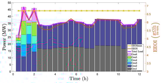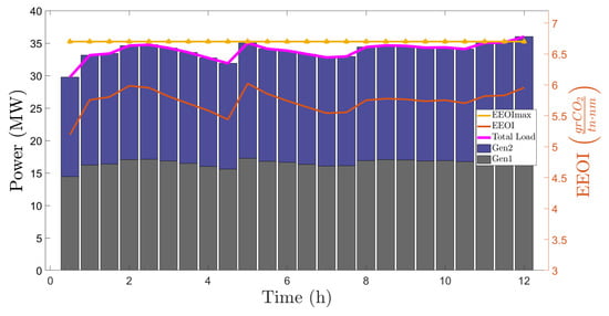 The second optimization problem given in Equations (8)–(13) deals with the optimal ship power generation scheduling. The results obtained for the first examined scenario are shown in Figure 11. EEOI per time interval and its maximum value are also illustrated. Emission compliance and power generation–load balance are satisfied with the use of only the two low-cost generators on board. The more environmentally friendly generators need not be turned on in this scenario. The total cost of this scenario is 41,716 m.u.