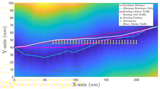The route that considers the marine traffic is shown in near-white color. The ship successfully bypasses the traffic while also noting similarities between the minimum distance and the minimum resistance path. Of course, if the traffic did not exist, the optimal route would be the magenta route, since the white route resulted in a 3.92% increase in the total electric energy needed for the electric propulsion motors, compared to the magenta route. This result is very important; it signals that PSO has found a solution better than the minimum distance path, even though there was heavy marine traffic inside the sea plane.