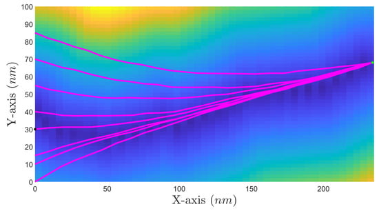 It is evident that starting points that are higher on the y-axis than the minimum resistance path reduce their y-axis position to align with it. With uniform resistance throughout the sea plane, the optimal solution would be the minimum distance path connecting the start and destination points in a straight line. A characteristic example of this is the case of the starting point with coordinates [0, 70]; its y-axis coordinate is very close to the destination point at [233.9, 68], but PSO identifies a route with a smaller resistance and lowers the y-coordinate to even less than 54 nm along the route, and then almost follows the minimum resistance path, to reduce the electric propulsion energy to reach the destination point.