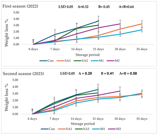 Fruit hardness gradually reduces with extended storage. Figure 3 shows that fruit firmness was preserved in all treatments. Mango fruits treated with a 200 mM melatonin solution followed by a 1 mM salicylic acid solution increased considerably in fruit firmness compared to control fruits, which showed greater softening rates in both seasons of Keitt mango fruits under postharvest refrigeration during 2022 and 2023. Data revealed that increasing the storage duration reduced weight loss, with fruits stored for 35 days recording the lowest values and those held for 7 days recording the highest values.