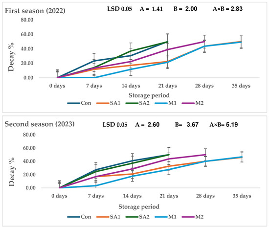 Effect of dipping with salicylic acid and melatonin on decay (%) of Keitt mango fruits under postharvest refrigeration during 2022 and 2023 seasons, with LSD analysis (A = treatments, B = storage periods, A × B = interaction).