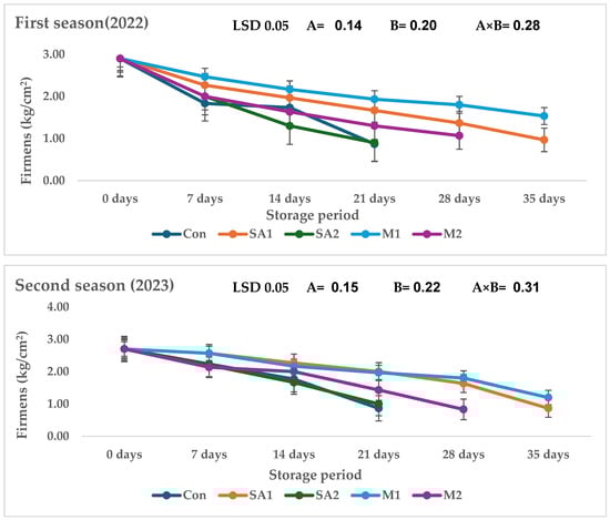 Effect of dipping with salicylic acid and melatonin on firmness kg/cm2 of Keitt mango fruits under postharvest refrigeration during 2022 and 2023 seasons, with LSD analysis (A = treatments, B = storage periods, A × B = interaction).