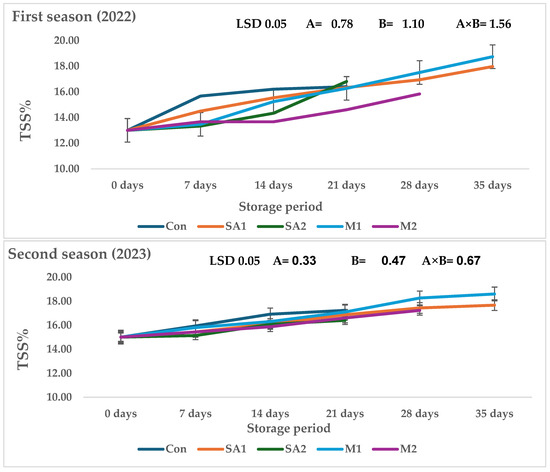 Effect of dipping with salicylic acid and melatonin on total soluble solids (TSS %) of Keitt mango fruits under postharvest refrigeration during 2022 and 2023 seasons, with LSD analysis (A = treatments, B = storage periods, A × B = interaction).