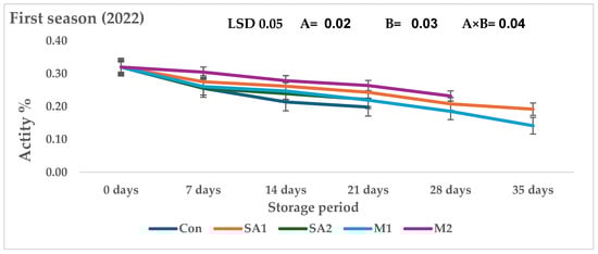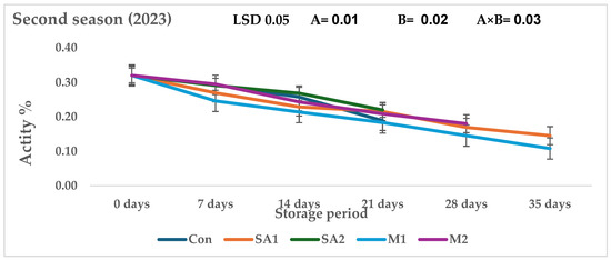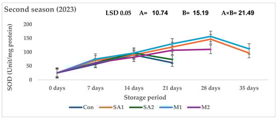 Enzyme activity (superoxide dismutase (SOD), catalase (CAT), and ascorbate peroxidase (APX)) significantly declined with prolonged storage, as seen in Figure 7, Figure 8 and Figure 9. Fruits treated with 200 mM melatonin solution, followed by 1 mM salicylic acid solution, showed significantly higher levels of SOD, CAT, and APX than the control treatment in both seasons of Keitt mango fruits under postharvest refrigeration in 2022 and 2023. The influence of storage length revealed that (SOD), (CAT), and (APX) dropped as the storage period increased, with fruits held for 35 days recording the lowest value compared to those stored for 7 days, which acquired the greatest values.