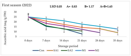 Dipping Keitt mango fruits in salicylic acid and melatonin solutions under postharvest chilling settings significantly raised ascorbic acid levels relative to the control treatment in two seasons. According to the results in Figure 6, dipping mango fruits in a melatonin solution at 200 mM produced the highest significant value of ascorbic acid, followed by dipping mango fruits in a salicylic acid solution at 1 mM, while the control treatment produced the lowest value in both seasons. Furthermore, data revealed that increasing storage duration reduced ascorbic acid levels, with fruits stored for 35 days having the lowest values and fruits stored for 7 days having the greatest values.
