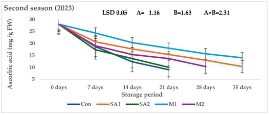 Generally, all measured chemical properties were significantly affected by salicylic acid and melatonin treatments in both the 2022 and 2023 seasons (Figure 4, Figure 5 and Figure 6). Salicylic acid treatment raised and improved their sweetness and general acceptability throughout storage [58]. Salicylic acid-treated fruits had a longer storage life and sustained TSS levels than untreated fruits [59]. Salicylic influences enzymes involved in sugar metabolism. For example, it can block invertase, an enzyme that converts sucrose to glucose and fructose, allowing sucrose levels to remain high [60]. Salicylic acid helps to slow down the metabolic pathways that cause sugar breakdown [61]. Melatonin alters the activity of enzymes involved in sugar metabolism. For example, it can block sugar-degrading enzymes, allowing TSS levels to remain high. This is also likely related to melatonin’s propensity to delay ripening, which allows sugars to build over a longer period [62]. Different melatonin concentrations have various effects on TSS, lower concentrations were shown to be more successful in sustaining greater TSS levels than larger concentrations, which occasionally resulted in a drop in TSS after lengthy storage due to metabolic imbalances [63]. Melatonin treatments aid in preserving overall acidity by delaying ripening and inhibiting metabolic processes that cause acid breakdown [64]. Melatonin-treated mangoes preserved their unique acidity and overall flavor profile for extended periods of storage due to greater amounts of organic acids. Melatonin also acts as a powerful antioxidant and anti-ethylene agent, aiding in the preservation of fruit quality after harvest [65]. Reduced acidity in fruits may result from faster acid consumption of organic acid in respiration [66], enhanced sugar accumulation, or better sugar delivery into fruit tissues and the conversion of organic acids to sugars [67]. Vitamin C is a powerful antioxidant due to its ability to trap hydroxyl and ability to neutralize superoxide radicals [68]. Postharvest treatment of salicylic acid not only retains the nutritional content of the fruits but also increases their total antioxidant capacity, making them more suitable for ingestion even after extended storage [69]. Melatonin therapy has been demonstrated to improve ascorbic acid concentration in a variety of fruits [70]. Melatonin suppresses degradation pathways while upregulating ascorbic acid synthesis pathways, resulting in an increase in ascorbic acid concentration [71]. In addition, Alebidi et al. [72] reported that inhibition of ascorbic acid oxidation by reducing ascorbate oxidase activity leads to a corresponding increase in ascorbic acid and thus maintains the concentration of ascorbic acid.