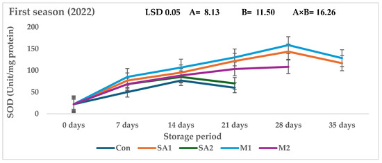 Effect of dipping with salicylic acid and melatonin on superoxide dismutase (SOD) of Keitt mango fruits under postharvest refrigeration during 2022 and 2023 seasons, with LSD analysis (A = treatments, B = storage periods, A × B = interaction).