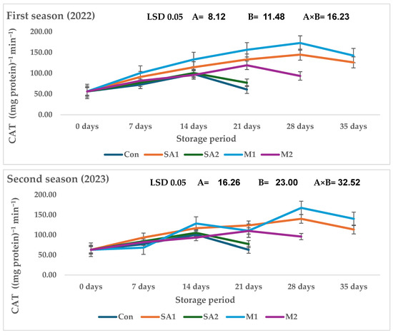 Effect of dipping with salicylic acid and melatonin on catalase (CAT) of Keitt mango fruits under postharvest refrigeration during 2022 and 2023 seasons, with LSD analysis (A = treatments, B = storage periods, A × B = interaction).