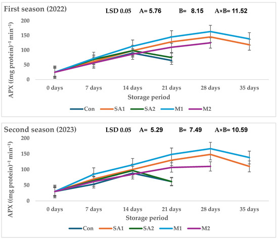 Effect of dipping with salicylic acid and melatonin on ascorbate peroxidase (APX) of Keitt mango fruits under postharvest refrigeration during 2022 and 2023 seasons, with LSD analysis (A = treatments, B = storage periods, A × B = interaction).