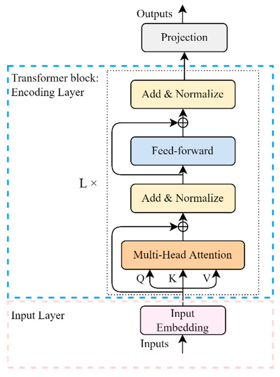 The iTransformer is a deep-learning model with an attention mechanism proposed by a team from Tsinghua University and Ant Group [21]. It adopts the encoder-only architecture of the Transformer [17], including the input embedding, Transformer block, and projection, as shown in Figure 1. This section elaborates on the iTransformer framework and implementation method proposed by Liu et al. [21].
