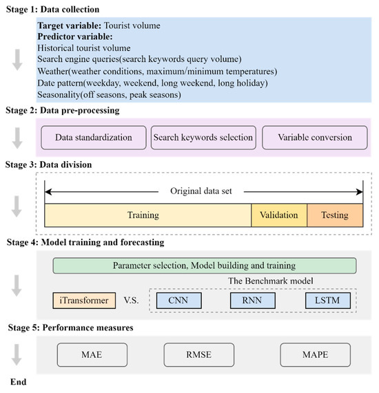 This study simultaneously considers historical data, search engine data, weather data, date pattern data, and seasonal data in the prediction of daily tourist volume in tourist cities. Based on these five types of data, an iTransformer architecture was proposed for predicting daily tourist volume. For comparison, we utilized LSTM, RNN, and CNN models, which are known for their superior performance in tourism demand forecasting, as our benchmark models. The research framework, as depicted in Figure 2, comprises five stages: data collection, data pre-processing, data division, model training and forecasting, and performance measures [64]. Each stage encompasses corresponding processing steps and methods. The following subsections provide a detailed description of these five stages.