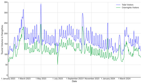 This study obtained data on the daily volume of domestic tourists and overnight tourists visiting Hangzhou City and Zhejiang Province from 1 January 2023 to 30 April 2024, through the Culture and Tourism Data Technology Innovation Lab of Zhejiang. The relevant indicators have currently been applied to Zhejiang Province’s holiday tourism monitoring and serve as official data for the tourism administration department of Zhejiang Province in China. We plotted the curve of historical tourist volume in Hangzhou (Figure 3) and in Zhejiang Province (Figure 4), both showing the volume of total domestic visitors and overnight visitors.