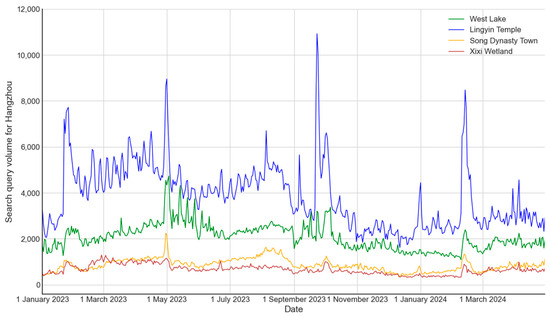 - Search engine query for Hangzhou. Based on tourist travel demands, we first selected several keywords related to Hangzhou tourism, such as “杭州美食 (Hangzhou cuisine)”, “杭州住宿 (Hangzhou hotels)”, “杭州交通 (Hangzhou transportation)”, “杭州旅游 (Hangzhou tourism)”, “杭州景点 (Hangzhou attractions)”, and major Hangzhou attractions, such as “西湖 (West Lake)”, “灵隐寺 (Lingyin Temple)”, “宋城 (Song Dynasty Town)”, “西溪湿地 (Xixi Wetland)”, “千岛湖 (Qiandao Lake)”, etc. Next, we calculated the Pearson correlation coefficients between the index of each keyword at different lag periods and tourist volume [65], selecting search query indices with Pearson correlation coefficients of 0.5 or higher. Finally, we obtained four keywords, namely “西湖 (West Lake)”, “灵隐寺 (Lingyin Temple)”, “宋城 (Song Dynasty Town)”, and “西溪湿地 (Xixi Wetland)”. The Baidu index of these four keywords from 1 January 2023 to 30 April 2024, is shown in Figure 5.