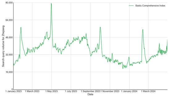 - Search engine query for Zhejiang Province. Following the keyword selection method mentioned above, we selected representative key tourist attractions from each prefecture-level city in Zhejiang Province. By calculating the Pearson correlation coefficient between each keyword index and the tourist volume, we ultimately chose 37 attraction names as keywords. The composite index of these 37 keywords showed a Pearson correlation coefficient above 0.5 with tourist volume. The composite Baidu Index of these 37 keywords from 1 January 2023 to 30 April 2024, is shown in Figure 6.
