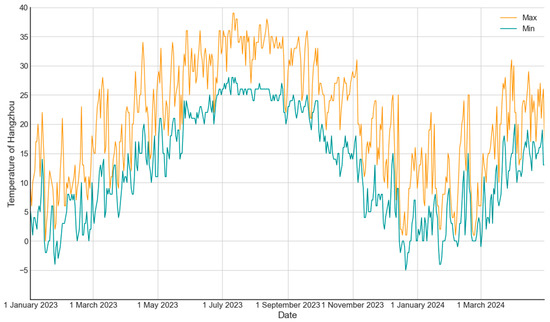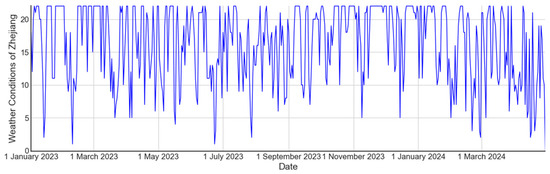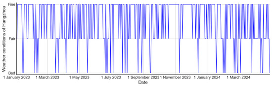 This study collected historical daily weather data from the China Meteorological website (http://www.weather.com.cn), accessed on 15 May 2024, primarily including the temperature and weather conditions of the destination. The temperature of the tourist destination is described as the highest and lowest temperatures [14]. Regarding the weather conditions of the destination, we followed Xu et al. [14] to categorize the weather into three classes—fine, fair, and bad—to reflect the impact of weather conditions on travel. We classified heavy rain, heavy snow, moderate rain, and moderate snow as bad weather; light rain, light snow, showers, and snow showers as fair weather; and sunny, cloudy, and overcast as fine weather. We converted the weather conditions from categorical variables to numerical data, transforming them into dummy variables according to the degree of impact on travel, specifically: bad = 0, fair = 1, and fine = 2. Figure 7 and Figure 8 show the historical daily highest and lowest temperatures, and historical daily weather conditions, respectively, in Hangzhou City from 1 January 2023 to 31 March 2024. For Zhejiang Province, since weather forecasts are provided by region, we averaged the maximum and minimum temperatures across the 11 prefecture-level cities. After converting weather conditions into numerical data, we aggregated the information. Figure 9 shows the historical daily maximum and minimum temperatures in Zhejiang Province, and Figure 10 shows the historical daily weather conditions.