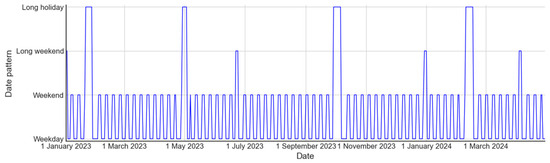 The impact of holidays on tourism demand is related to the length of the holidays [63]. In addition to weekends, China’s statutory holidays are generally divided into 3-day and 7-day holidays, with a 5-day holiday in the case of adjusted rest days (such as Labor Day in 2023 and 2024). We referred to the method proposed by Xu et al. [14] to represent the date pattern with four values: weekday, weekend (two-day holiday), long weekend (three-day holiday), and long holiday (5 or 7 days of holiday). We converted the date pattern from a categorical variable to numerical data, transforming it into dummy variables according to the length of the holiday, specifically: workday = 0, weekend = 1, long weekend = 2, and long holiday = 3. Figure 11 shows the daily date pattern in Zhejiang Province from 1 January 2023 to 31 March 2024.