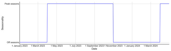 Seasonality reflects the overall scale of tourists in a certain period, with tourism demand exhibiting distinct off-peak and peak seasons. The peak tourism season in Zhejiang Province is from 1 April to 31 October every year, while the off-season is from 1 November to 31 March every year. We transformed the seasonal factor into dummy variables, setting the off-season as 0 and the peak season as 1. Figure 12 illustrates the daily seasonality in Zhejiang Province from 1 January 2023 to 31 March 2024.