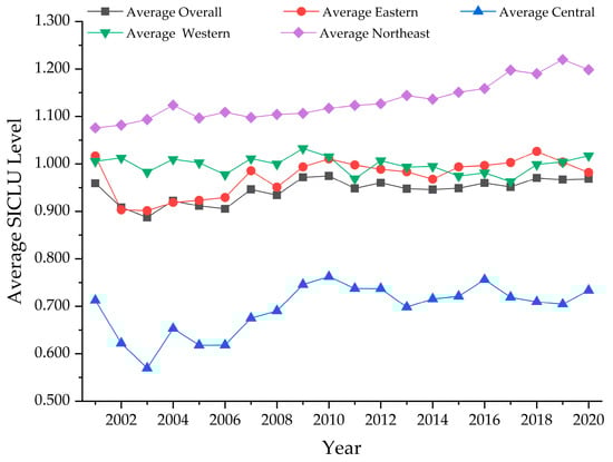 There is a significant disparity in the SICLU levels among the four main areas, at the regional level. Throughout the study period, the average SICLU level in the northeast consistently surpassed the national average, while the average SICLU level in the central region consistently remained below the national average. The northeast region boasts the highest overall SICLU level, followed by the western and eastern regions, with the central region exhibiting the lowest level. The relatively lower SICLU level in the central region can be attributed to its status as China’s primary grain-producing area. Apart from Shanxi province, the other five provinces in this region are major grain producers, predominantly focused on agriculture and endowed with abundant arable land. These regions attract substantial agricultural inputs, resulting in high levels of undesirable outputs [54]. The cumulative effects of the “reverse ecological” impacts on arable land are relatively significant, leading to the comparatively lower SICLU levels in the central region.