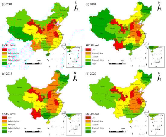 Spatial patterns of SICLU levels in 31 Chinese provinces in 2001 (a), 2010 (b), 2015 (c), and 2020 (d).