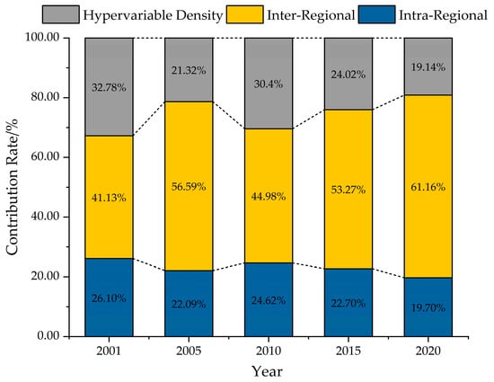 From 2001 to 2020, the average contribution rate of the inter-regional disparities reached 53.15%, while the hypervariable density and intra-regional average contribution rates were similar, at 24.04% and 22.81%, respectively. This indicates that inter-regional disparities are the primary source of the non-equilibrium spatial dynamics in the SICLU (Figure 3). Over time, the proportion of inter-regional imbalances has grown steadily. It rose from 41.13% in 2001 to 61.16% in 2020, with an average annual growth rate of 2.01%. This suggests that the regions in China with higher SICLU levels are widening the overall gap in relation to other areas and the differentiation trend is gradually intensifying. The rates of intra-regional imbalance and hypervariable density have both fallen steadily. The hypervariable density has declined at a quicker pace than the intra-regional disparities. In 2001, the hypervariable density accounted for 32.78% of the total, but by 2020, it had decreased to 19.14%. On average, there was a yearly reduction of 2.65%. During some periods, specifically 2002–2005, 2013–2016, and 2018–2020, the contribution rate of the inter-regional imbalance remained consistently steady at 56%, 52%, and 61%, correspondingly.