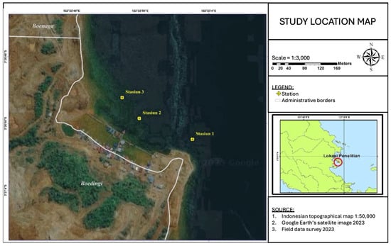This study was performed in the local waters of Boedingi Village, Lasolo Islands, which administratively belongs to the North Konawe District, Southeast Sulawesi Province, Indonesia. The waters of Boedingi Village feature a pier used for fishing boats and transport ships as well as a separate pier for a mining company, which is used for loading and unloading mining products. Additionally, there are residential areas located along the coastal waters.